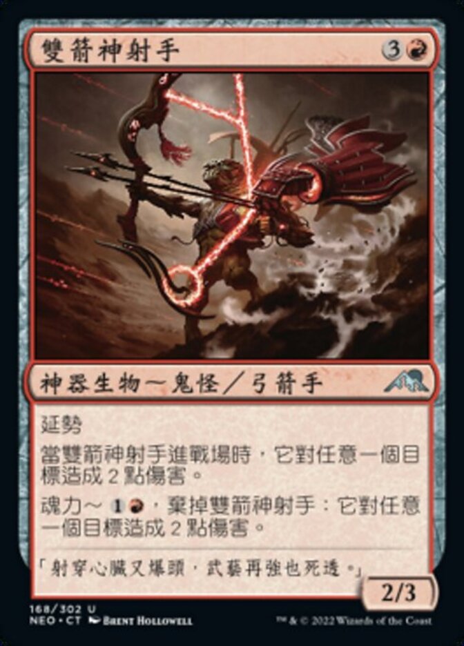 | Rules | Reach When Twinshot Sniper enters the battlefield, it deals 2 damage to any target. Channel — , Discard Twinshot Sniper: It deals 2 damage to any target. |