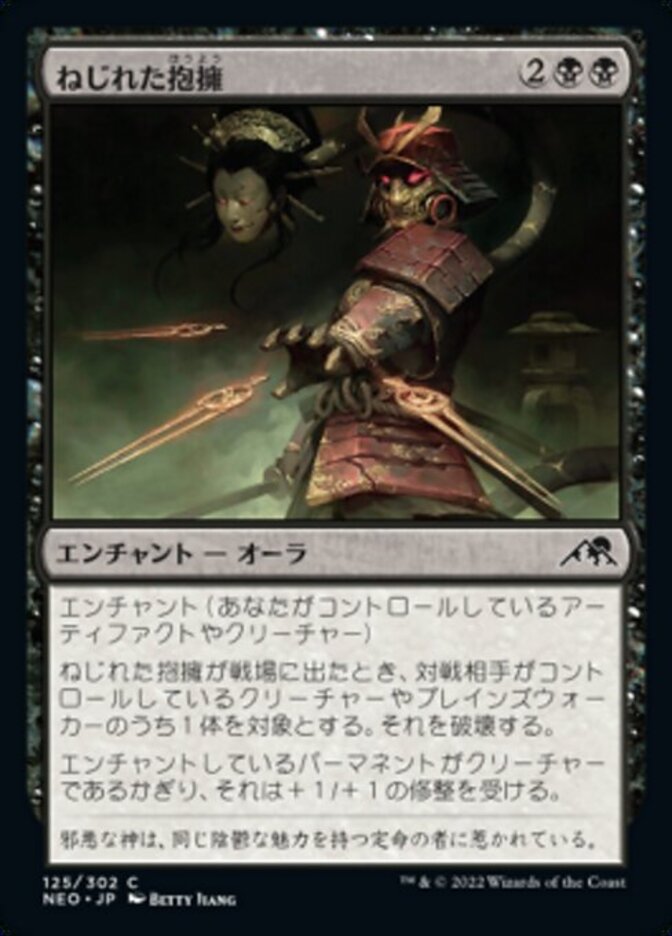 | Rules | Enchant artifact or creature you control When Twisted Embrace enters the battlefield, destroy target creature or planeswalker an opponent controls. As long as enchanted permanent is a creature, it gets +1/+1. |
