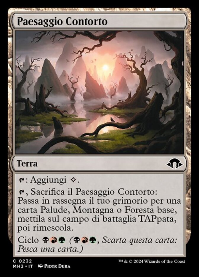 | Rules | : Add . , Sacrifice Twisted Landscape: Search your library for a basic Swamp, Mountain, or Forest card, put it onto the battlefield tapped, then shuffle. Cycling (, Discard this card: Draw a card.) |