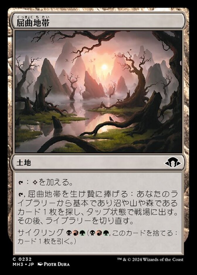 | Rules | : Add . , Sacrifice Twisted Landscape: Search your library for a basic Swamp, Mountain, or Forest card, put it onto the battlefield tapped, then shuffle. Cycling (, Discard this card: Draw a card.) |