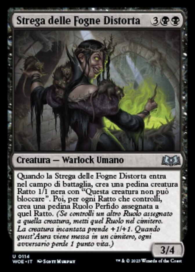 | Rules | When Twisted Sewer-Witch enters the battlefield, create a 1/1 black Rat creature token with "This creature can't block." Then for each Rat you control, create a Wicked Role token attached to that Rat. (If you control another Role on it, put that one into the graveyard. Enchanted creature gets +1/+1. When this Aura is put into a graveyard, each opponent loses 1 life.) |