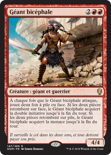 Rules Whenever Two-Headed Giant attacks, flip two coins. If both coins come up heads, Two-Headed Giant gains double strike until end of turn. If both coins come up tails, Two-Headed Giant gains menace until end of turn.