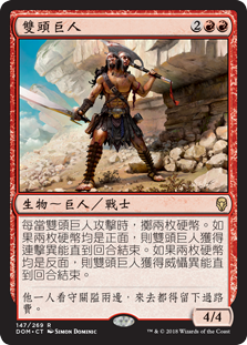 | Rules | Whenever Two-Headed Giant attacks, flip two coins. If both coins come up heads, Two-Headed Giant gains double strike until end of turn. If both coins come up tails, Two-Headed Giant gains menace until end of turn. |