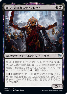 | Rules | Tymaret's toughness is equal to your devotion to black. (Each in the mana costs of permanents you control counts toward your devotion to black.) : Exile up to two target cards from graveyards. You gain 1 life for each creature card exiled this way. |