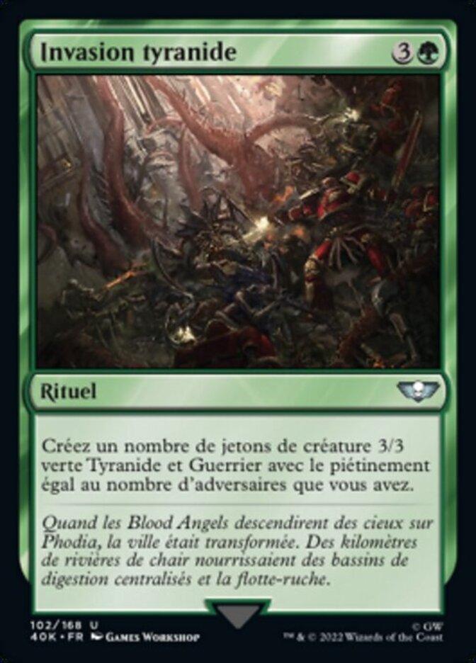 | Rules | Create a number of 3/3 green Tyranid Warrior creature tokens with trample equal to the number of opponents you have. |