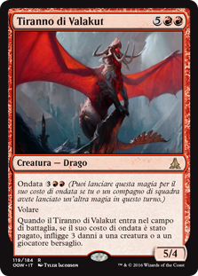 | Rules | Surge (You may cast this spell for its surge cost if you or a teammate has cast another spell this turn.) Flying When Tyrant of Valakut enters the battlefield, if its surge cost was paid, it deals 3 damage to any target. |