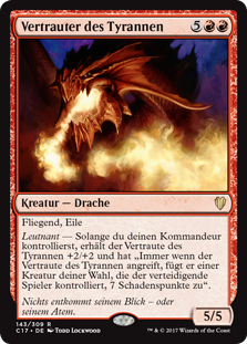 | Rules | Flying, haste Lieutenant — As long as you control your commander, Tyrant's Familiar gets +2/+2 and has "Whenever Tyrant's Familiar attacks, it deals 7 damage to target creature defending player controls." |