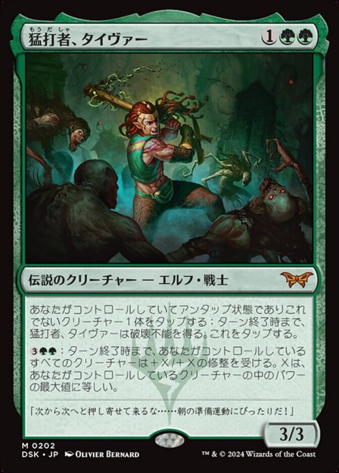 | Rules | Tap another untapped creature you control: Tyvar, the Pummeler gains indestructible until end of turn. Tap it. : Creatures you control get +X/+X until end of turn, where X is the greatest power among creatures you control. |