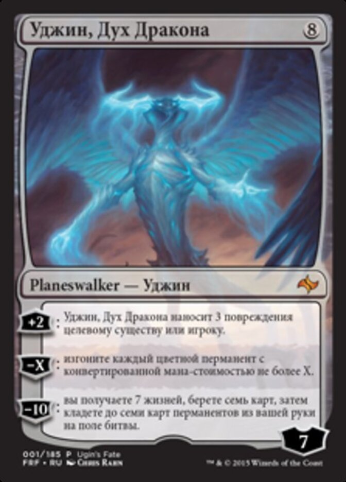 | Rules | +2: Ugin, the Spirit Dragon deals 3 damage to any target. −X: Exile each permanent with mana value X or less that's one or more colors. −10: You gain 7 life, draw seven cards, then put up to seven permanent cards from your hand onto the battlefield. |