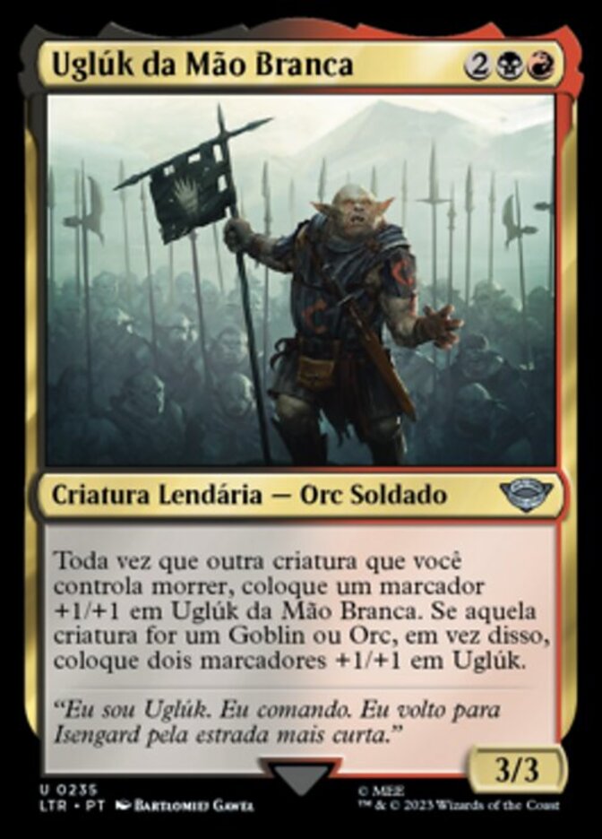 | Rules | Whenever another creature you control dies, put a +1/+1 counter on Uglúk of the White Hand. If that creature was a Goblin or Orc, put two +1/+1 counters on Uglúk instead. |
