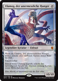 | Rules | When you cast this spell, exile two target permanents. Indestructible Whenever Ulamog, the Ceaseless Hunger attacks, defending player exiles the top twenty cards of their library. |
