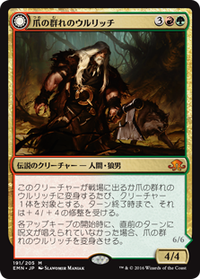 | Rules | Whenever this creature enters the battlefield or transforms into Ulrich of the Krallenhorde, target creature gets +4/+4 until end of turn. At the beginning of each upkeep, if no spells were cast last turn, transform Ulrich of the Krallenhorde. // Whenever this creature transforms into Ulrich, Uncontested Alpha, you may have it fight target non-Werewolf creature you don't control. At the beginning of each upkeep, if a player cast two or more spells last turn, transform Ulrich, Uncontested Alpha. |