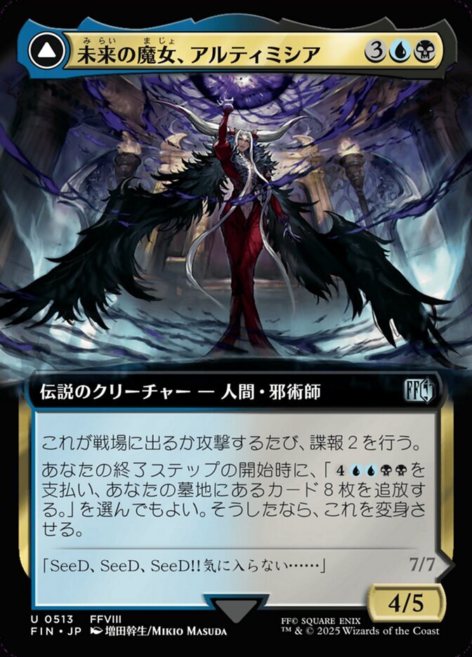 | Rules | Whenever Ultimecia enters or attacks, surveil 2. (Look at the top two cards of your library, then put any number of them into your graveyard and the rest on top of your library in any order.) At the beginning of your end step, you may pay and exile eight cards from your graveyard. If you do, transform Ultimecia. // Menace (This creature can't be blocked except by two or more creatures.) Time Compression — When this creature transforms into Ultimecia, Omnipotent, take an extra turn after this one. |
