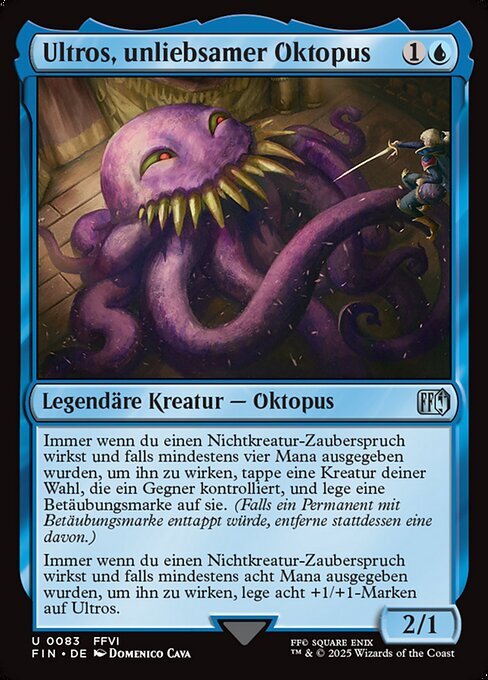 | Rules | Whenever you cast a noncreature spell, if at least four mana was spent to cast it, tap target creature an opponent controls and put a stun counter on it. (If a permanent with a stun counter would become untapped, remove one from it instead.) Whenever you cast a noncreature spell, if at least eight mana was spent to cast it, put eight +1/+1 counters on Ultros. |
