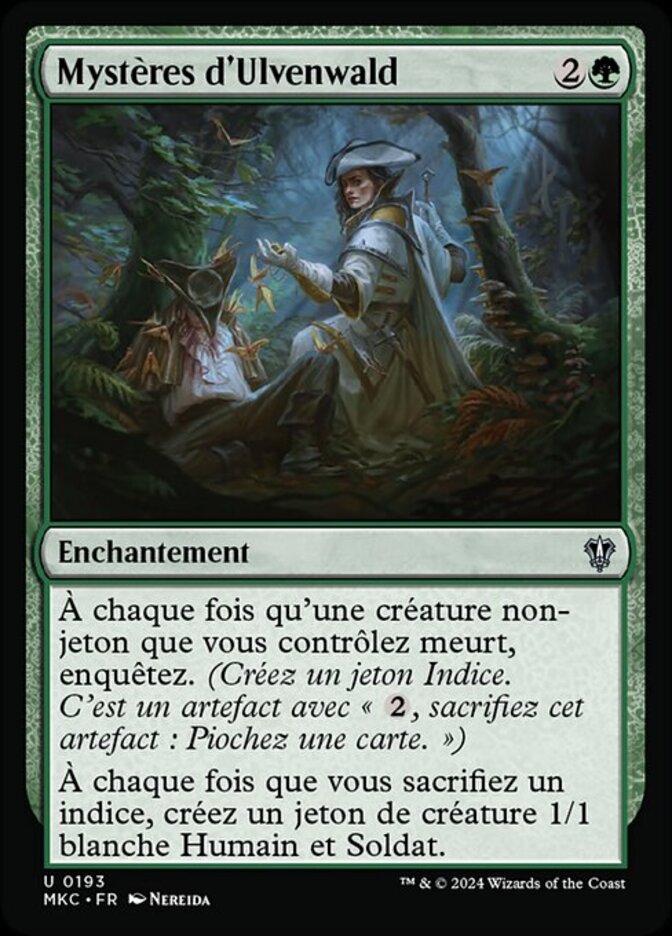 | Rules | Whenever a nontoken creature you control dies, investigate. (Create a colorless Clue artifact token with ", Sacrifice this artifact: Draw a card.") Whenever you sacrifice a Clue, create a 1/1 white Human Soldier creature token. |