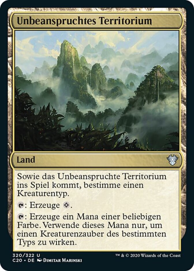 | Rules | As Unclaimed Territory enters the battlefield, choose a creature type. : Add . : Add one mana of any color. Spend this mana only to cast a creature spell of the chosen type. |