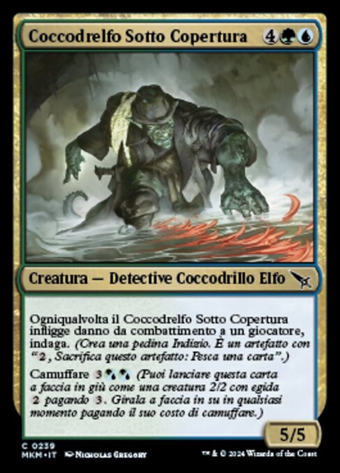 | Rules | Whenever Undercover Crocodelf deals combat damage to a player, investigate. (Create a Clue token. It's an artifact with ", Sacrifice this artifact: Draw a card.") Disguise (You may cast this card face down for as a 2/2 creature with ward . Turn it face up any time for its disguise cost.) |
