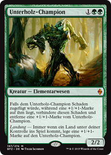 | Rules | If damage would be dealt to Undergrowth Champion while it has a +1/+1 counter on it, prevent that damage and remove a +1/+1 counter from Undergrowth Champion. Landfall — Whenever a land enters the battlefield under your control, put a +1/+1 counter on Undergrowth Champion. |