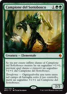 | Rules | If damage would be dealt to Undergrowth Champion while it has a +1/+1 counter on it, prevent that damage and remove a +1/+1 counter from Undergrowth Champion. Landfall — Whenever a land enters the battlefield under your control, put a +1/+1 counter on Undergrowth Champion. |