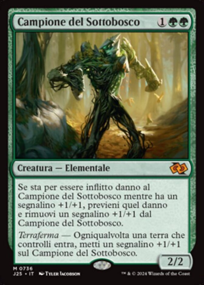 | Rules | If damage would be dealt to Undergrowth Champion while it has a +1/+1 counter on it, prevent that damage and remove a +1/+1 counter from Undergrowth Champion. Landfall — Whenever a land enters the battlefield under your control, put a +1/+1 counter on Undergrowth Champion. |