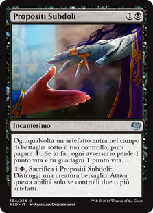 | Rules | Whenever an artifact enters the battlefield under your control, you may pay . If you do, each opponent loses 1 life and you gain 1 life. , Sacrifice Underhanded Designs: Destroy target creature. Activate only if you control two or more artifacts. |