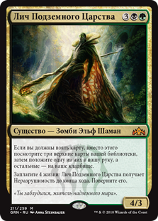 | Rules | If you would draw a card, instead look at the top three cards of your library, then put one into your hand and the rest into your graveyard. Pay 4 life: Underrealm Lich gains indestructible until end of turn. Tap it. |