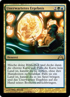 | Rules | Shuffle your library, then reveal the top card. If it's a nonland card, you may cast it without paying its mana cost. If it's a land card, you may put it onto the battlefield and return Unexpected Results to its owner's hand. |