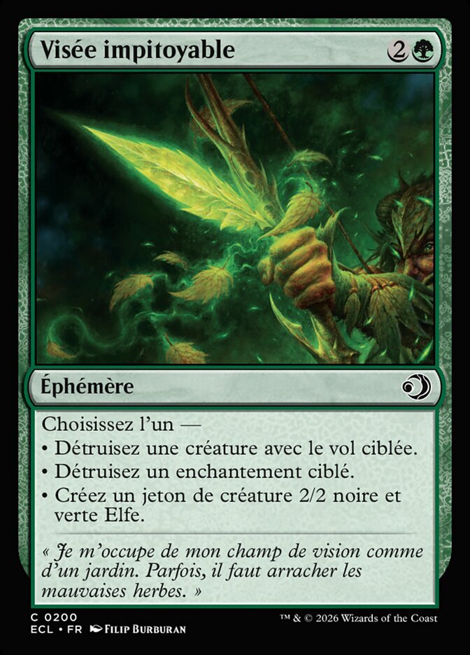 | Rules | Choose one — • Destroy target creature with flying. • Destroy target enchantment. • Create a 2/2 black and green Elf creature token. |