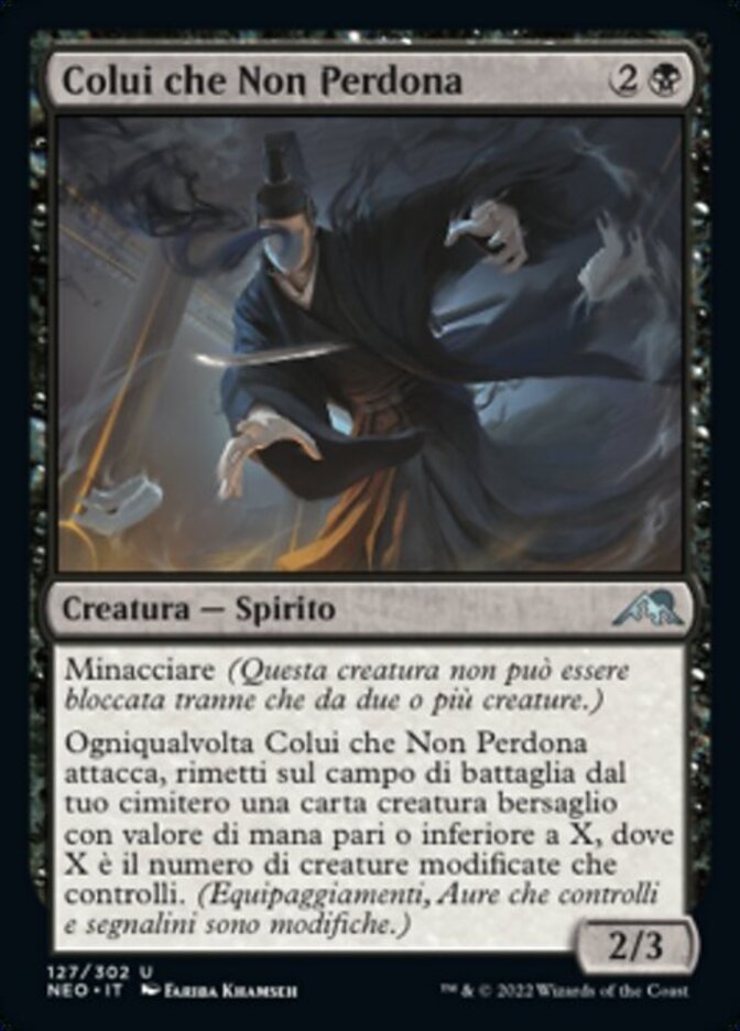| Rules | Menace (This creature can't be blocked except by two or more creatures.) Whenever Unforgiving One attacks, return target creature card with mana value X or less from your graveyard to the battlefield, where X is the number of modified creatures you control. (Equipment, Auras you control, and counters are modifications.) |