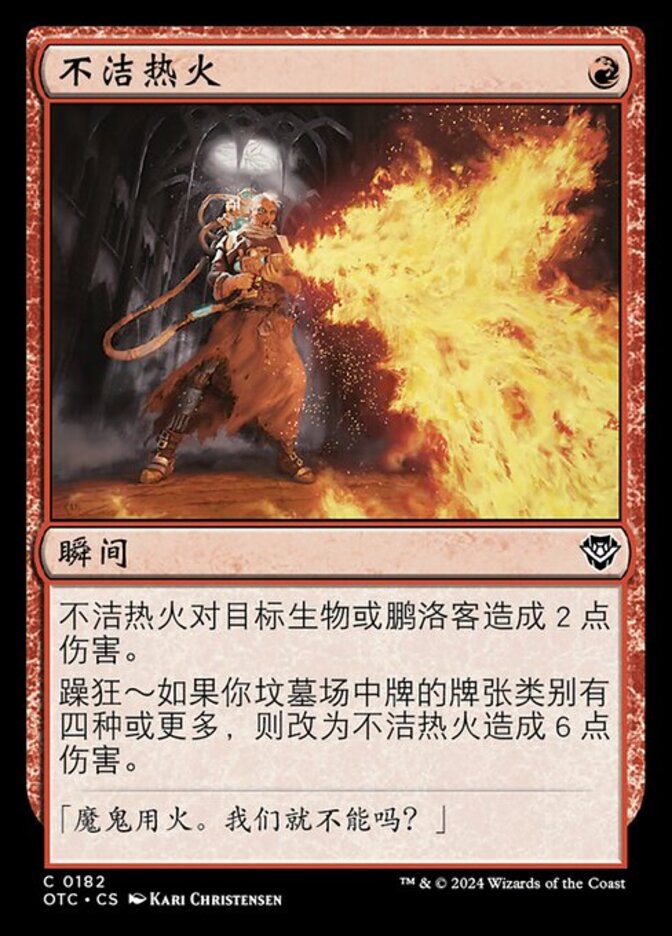 | Rules | Unholy Heat deals 2 damage to target creature or planeswalker. Delirium — Unholy Heat deals 6 damage instead if there are four or more card types among cards in your graveyard. |