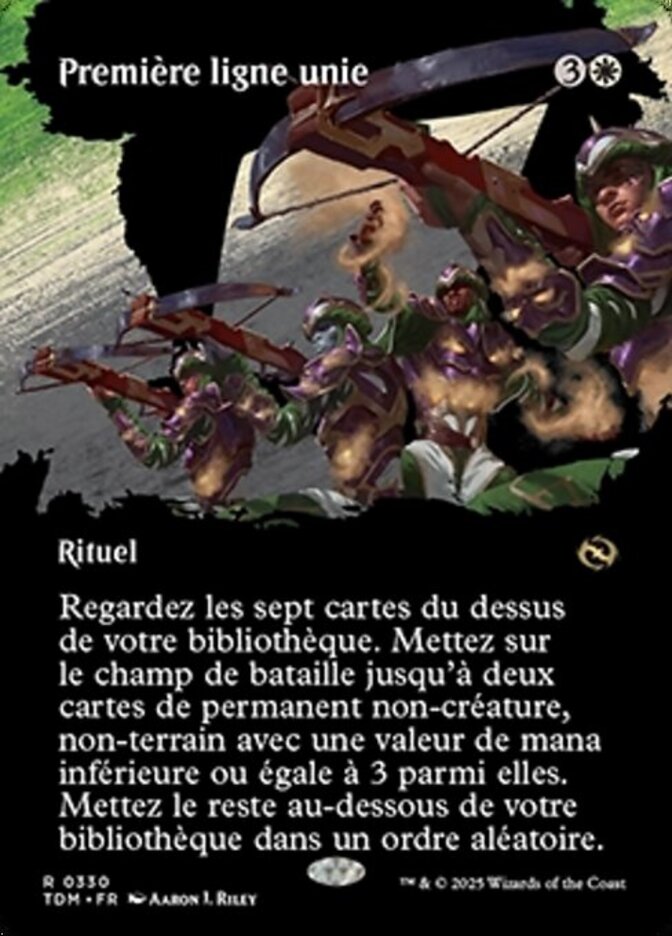 | Rules | Look at the top seven cards of your library. Put up to two noncreature, nonland permanent cards with mana value 3 or less from among them onto the battlefield. Put the rest on the bottom of your library in a random order. |