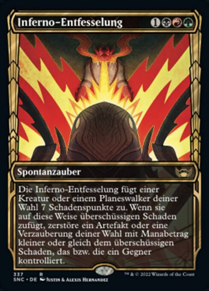 | Rules | Unleash the Inferno deals 7 damage to target creature or planeswalker. When it deals excess damage this way, destroy target artifact or enchantment an opponent controls with mana value less than or equal to that amount of excess damage. |