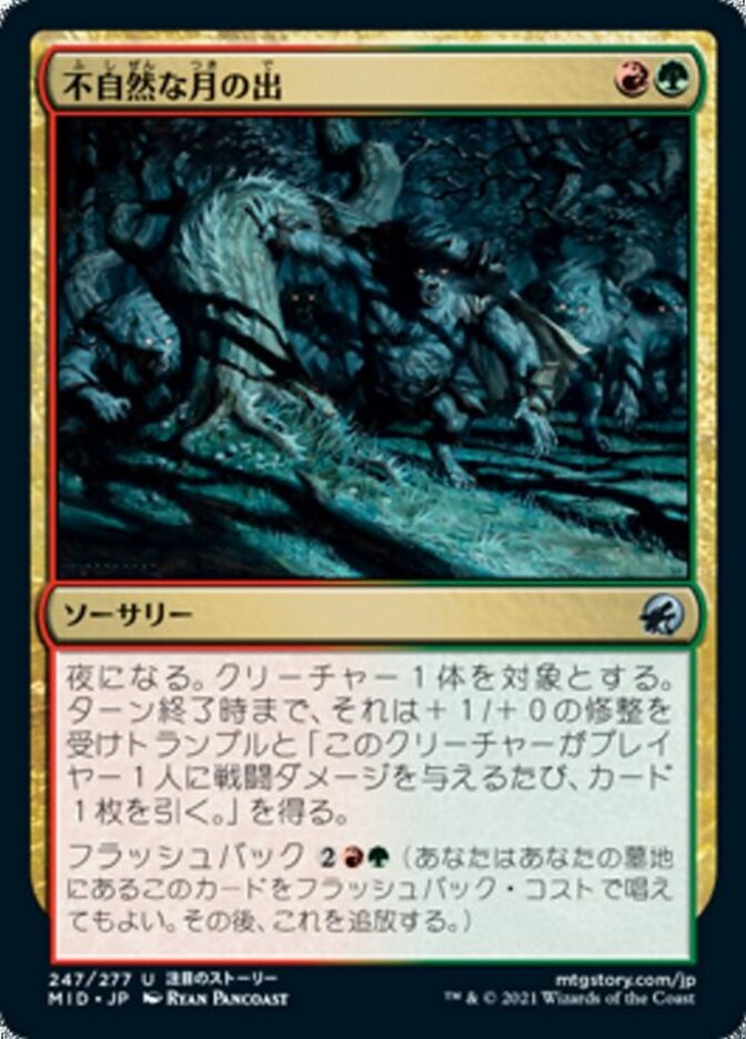 | Rules | It becomes night. Until end of turn, target creature gets +1/+0 and gains trample and "Whenever this creature deals combat damage to a player, draw a card." Flashback (You may cast this card from your graveyard for its flashback cost. Then exile it.) |