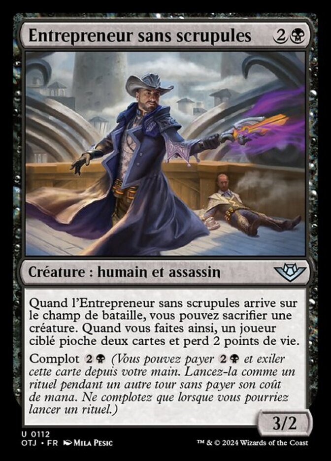 | Rules | When Unscrupulous Contractor enters the battlefield, you may sacrifice a creature. When you do, target player draws two cards and loses 2 life. Plot (You may pay and exile this card from your hand. Cast it as a sorcery on a later turn without paying its mana cost. Plot only as a sorcery.) |