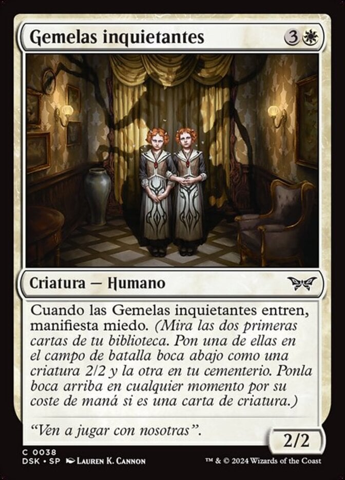| Rules | When Unsettling Twins enters, manifest dread. (Look at the top two cards of your library. Put one onto the battlefield face down as a 2/2 creature and the other into your graveyard. Turn it face up any time for its mana cost if it's a creature card.) |