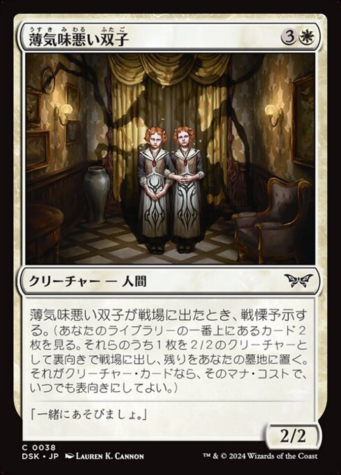 | Rules | When Unsettling Twins enters, manifest dread. (Look at the top two cards of your library. Put one onto the battlefield face down as a 2/2 creature and the other into your graveyard. Turn it face up any time for its mana cost if it's a creature card.) |