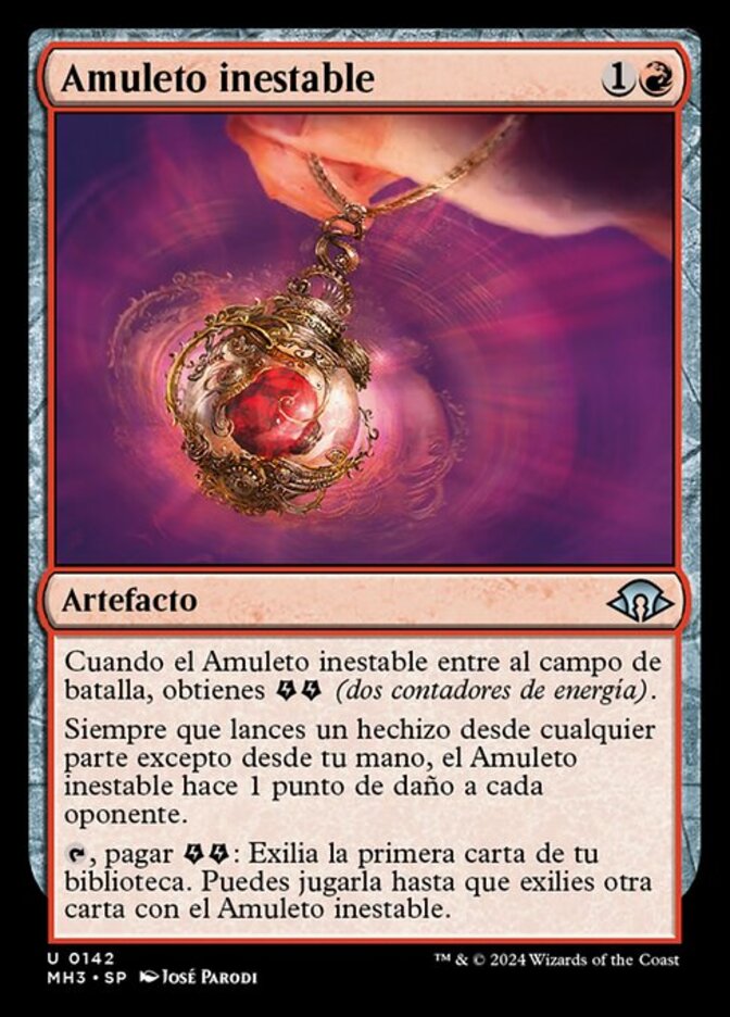 | Rules | When Unstable Amulet enters the battlefield, you get (two energy counters). Whenever you cast a spell from anywhere other than your hand, Unstable Amulet deals 1 damage to each opponent. , Pay : Exile the top card of your library. You may play it until you exile another card with Unstable Amulet. |