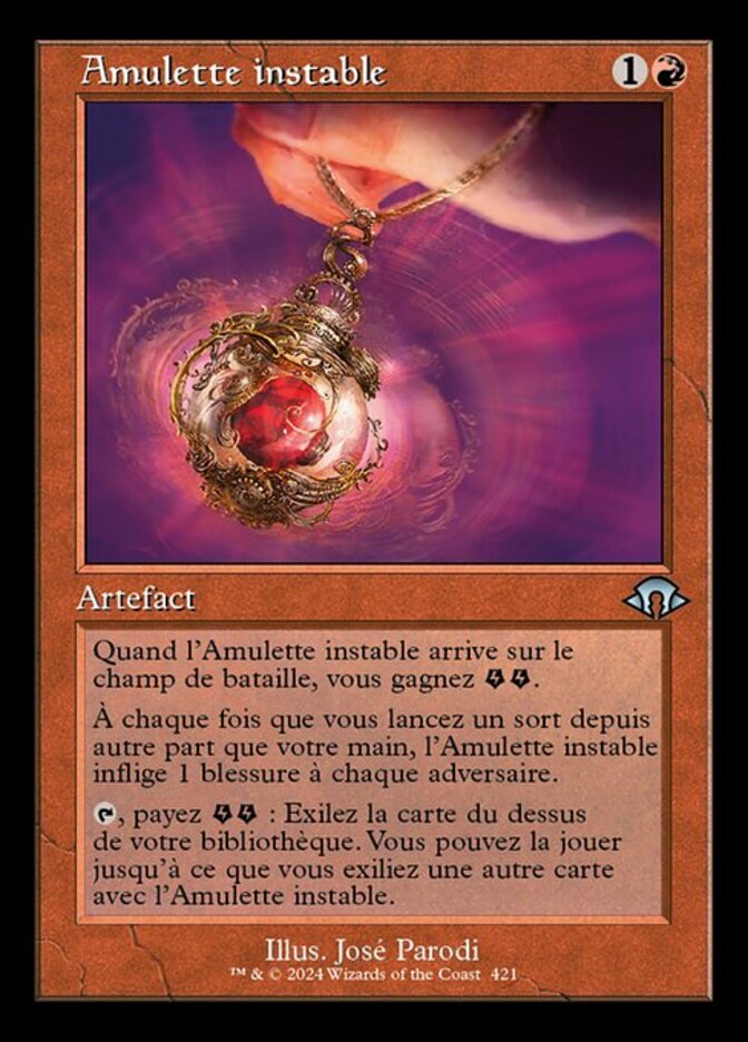 | Rules | When Unstable Amulet enters the battlefield, you get (two energy counters). Whenever you cast a spell from anywhere other than your hand, Unstable Amulet deals 1 damage to each opponent. , Pay : Exile the top card of your library. You may play it until you exile another card with Unstable Amulet. |