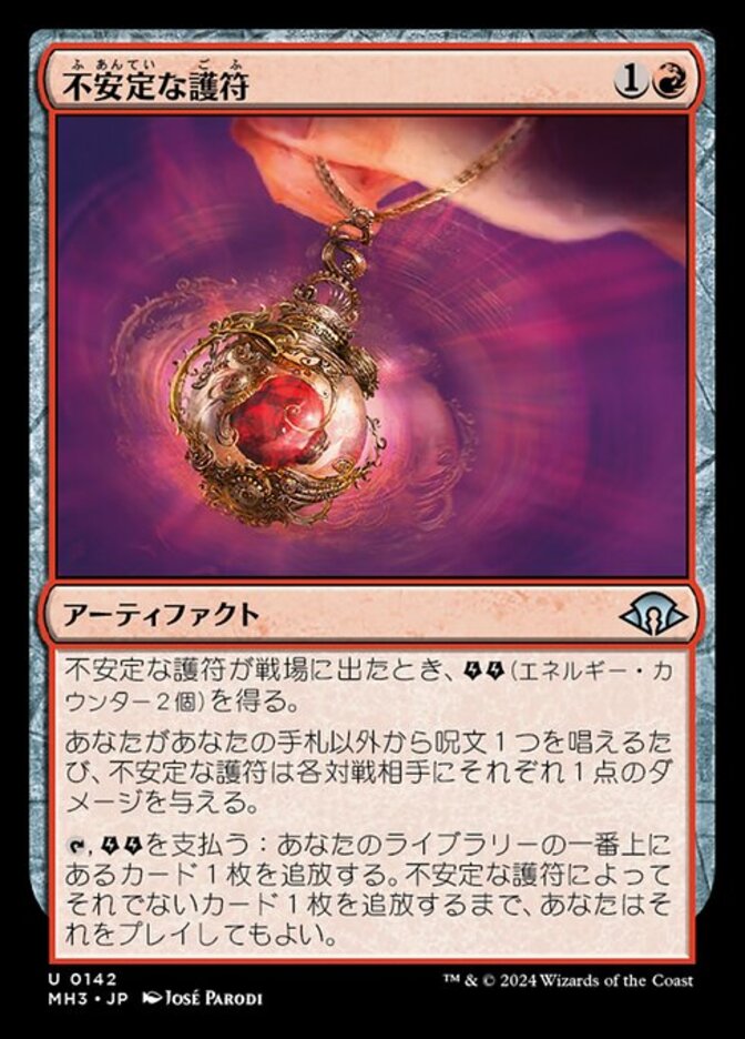 | Rules | When Unstable Amulet enters the battlefield, you get (two energy counters). Whenever you cast a spell from anywhere other than your hand, Unstable Amulet deals 1 damage to each opponent. , Pay : Exile the top card of your library. You may play it until you exile another card with Unstable Amulet. |