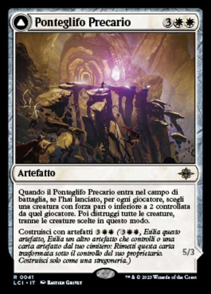| Rules | When Unstable Glyphbridge enters the battlefield, if you cast it, for each player, choose a creature with power 2 or less that player controls. Then destroy all creatures except creatures chosen this way. Craft with artifact (, Exile this artifact, Exile another artifact you control or an artifact card from your graveyard: Return this card transformed under its owner's control. Craft only as a sorcery.) // Flying Whenever an opponent casts a spell during their turn, they can't attack you or planeswalkers you control this turn. Each opponent who attacked you or a planeswalker you control this turn can't cast spells. |