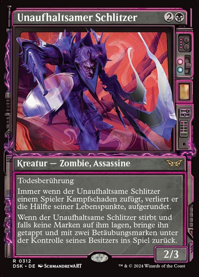 | Rules | Deathtouch Whenever Unstoppable Slasher deals combat damage to a player, they lose half their life, rounded up. When Unstoppable Slasher dies, if it had no counters on it, return it to the battlefield tapped under its owner's control with two stun counters on it. |