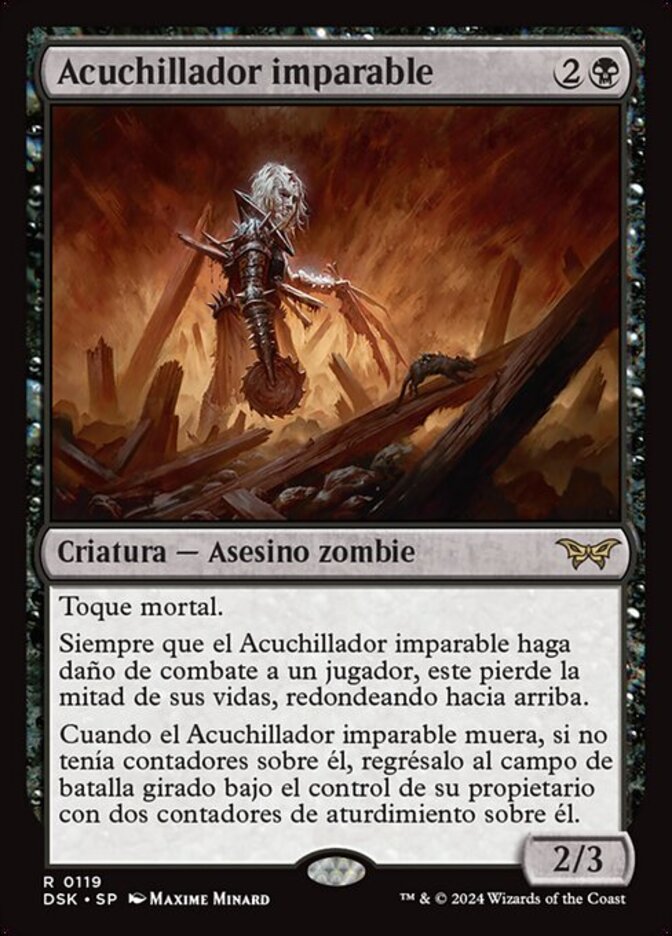 | Rules | Deathtouch Whenever Unstoppable Slasher deals combat damage to a player, they lose half their life, rounded up. When Unstoppable Slasher dies, if it had no counters on it, return it to the battlefield tapped under its owner's control with two stun counters on it. |