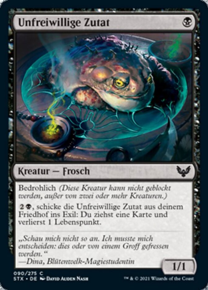 | Rules | Menace (This creature can't be blocked except by two or more creatures.) , Exile Unwilling Ingredient from your graveyard: You draw a card and you lose 1 life. |