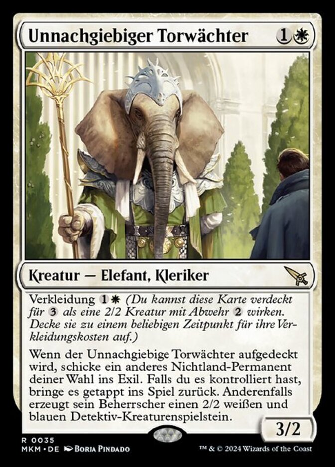 | Rules | Disguise (You may cast this card face down for as a 2/2 creature with ward . Turn it face up any time for its disguise cost.) When Unyielding Gatekeeper is turned face up, exile another target nonland permanent. If you controlled it, return it to the battlefield tapped. Otherwise, its controller creates a 2/2 white and blue Detective creature token. |
