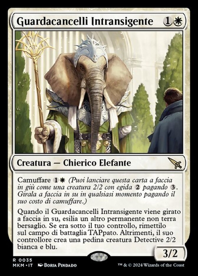 | Rules | Disguise (You may cast this card face down for as a 2/2 creature with ward . Turn it face up any time for its disguise cost.) When Unyielding Gatekeeper is turned face up, exile another target nonland permanent. If you controlled it, return it to the battlefield tapped. Otherwise, its controller creates a 2/2 white and blue Detective creature token. |