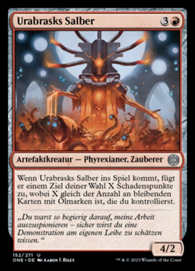 | Rules | When Urabrask's Anointer enters the battlefield, it deals X damage to any target, where X is the number of permanents you control with oil counters on them. |