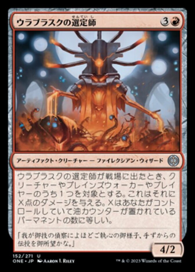 | Rules | When Urabrask's Anointer enters the battlefield, it deals X damage to any target, where X is the number of permanents you control with oil counters on them. |