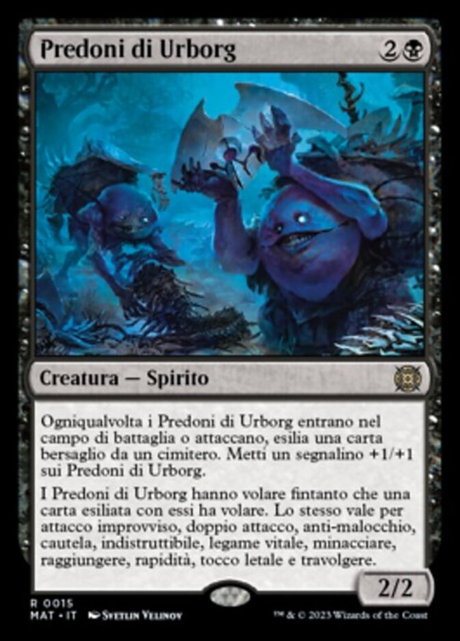 | Rules | Whenever Urborg Scavengers enters the battlefield or attacks, exile target card from a graveyard. Put a +1/+1 counter on Urborg Scavengers. Urborg Scavengers has flying as long as a card exiled with it has flying. The same is true for first strike, double strike, deathtouch, haste, hexproof, indestructible, lifelink, menace, reach, trample, and vigilance. |