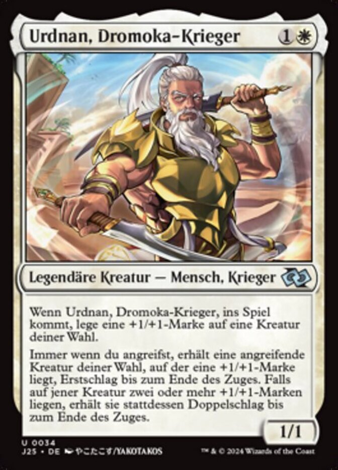 | Rules | When Urdnan, Dromoka Warrior enters, put a +1/+1 counter on target creature. Whenever you attack, target attacking creature with a +1/+1 counter on it gains first strike until end of turn. If that creature has two or more +1/+1 counters on it, it gains double strike until end of turn instead. |