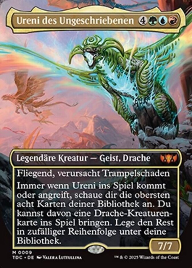 | Rules | Flying, trample Whenever Ureni enters or attacks, look at the top eight cards of your library. You may put a Dragon creature card from among them onto the battlefield. Put the rest on the bottom of your library in a random order. |